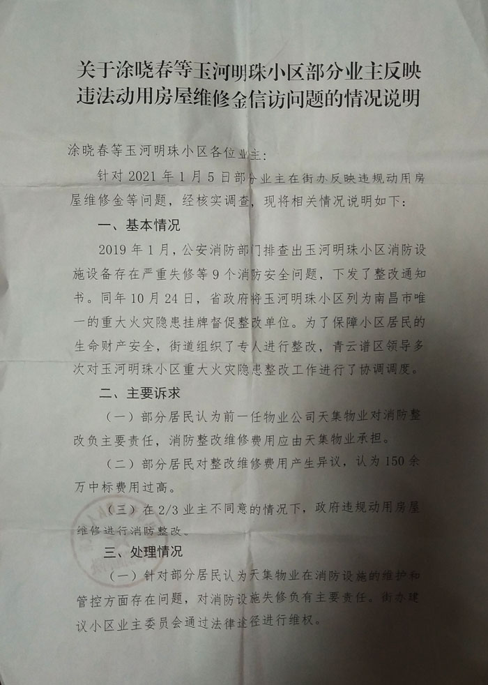 关于涂晓春等玉河明珠小区部分业主反映违法动用房屋维修基金信访问题的情况说明
