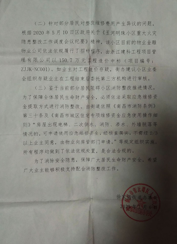 (二)针对部分居民对整改维修费用产生异议的问题,根据2020年5月10日区政关于《王河明珠小区重大火灾隐患整改工作调度会议纪要》精神,该小区目前的物业金雕物业公司依依法规履行了招标程序,由浙江建科工程项目管限公可以150.7万元工程造价中标(项目编号:ZJJK-NC001)。如业主对工程造价存疑,街办建议小区业委会组织存疑业主在工程结束后委托第三方机构进行审核。
