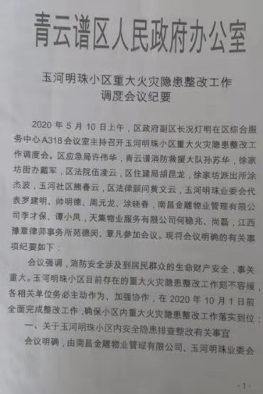 2020年5月10日上午,区政府副区长况灯明在区综合服务中心A318会议室主持召开玉河明珠小区重大火灾隐患整改工作调度会。区应急局许伟华,青云谱消防救援大队孙苏华,徐家坊街办戴军,区法院伍漫云,区住建局胡昆龙,徐家坊派出所涂杰波,玉河社区熊春云,区法律顾问黄文云,玉河明珠业委会代表罗建明,帅明德、周元龙、涂晓春,南昌金雕物业管理有限公司李才保,谭小风,天集物业服务有限公司何稳兆、尚磊,江西豫章律师事务所苑德闵、章凡参加会议。现得会议明确的有关事项纪要如下: