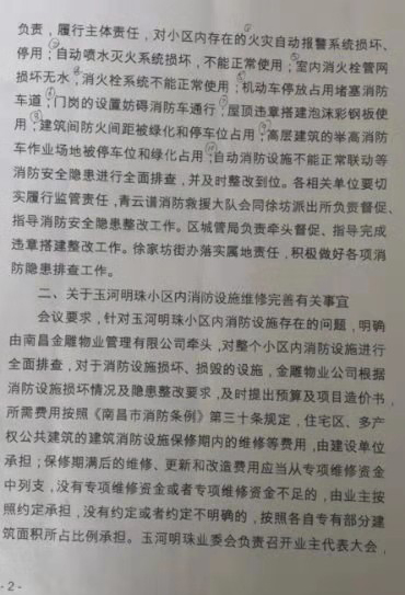 造价书等资料。徐家坊街办,玉河社区负责督促、指导,协调玉河明珠业委会召开全体业主代表大会。区住建局负责做好业务指导工作。青云消防救援大队负责监督指导消防设施建设完善。徐家坊派出所负责保障消防设施维修工作正常进行对违法违阻挠消防设施整改的人员,依法依规进行严厉打击