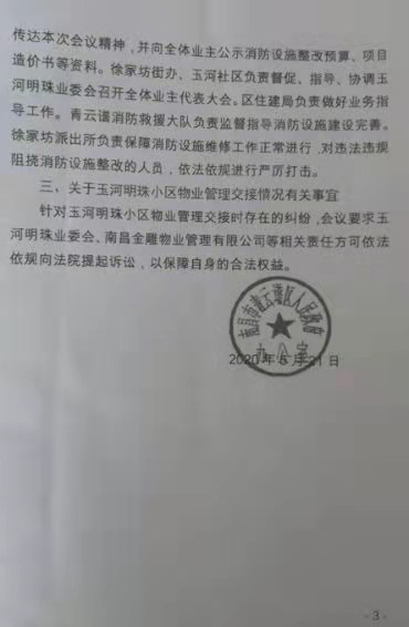 针对玉河明珠小区物业管理交接时存在的纠纷,会议要求玉河明珠业委会,南昌金雕物业管理有限公司等相关责任方可依法依规向法院提起诉讼,以保障自身的合法权益。