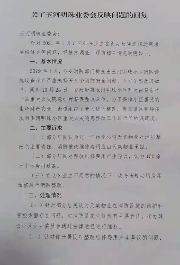 2019年1月,公安消防部门排查出玉河明珠小区消防设施设备存在严重失修等9个消防安全问题,下发了整改通知书。同年10月24日,省政府将玉河明珠小区列为南昌市唯的重大火灾隐患挂牌督促整改单位。为了保障小区居民的生命财产安全,街道组织了专人进行整改,青云谱区领导多次对玉河明珠小区重大火灾隐患整改工作进行了协调调度。