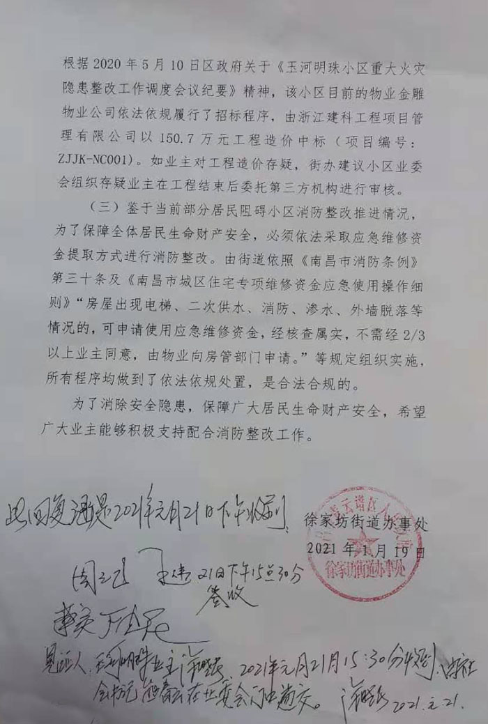 (二)针对部分居民对整改维修费用产生异议的问题, 根据2020年5月10日区政府关于《玉河明珠小区重大火灾隐患整改工作调度会议纪要》精神,该小区目前的物业金雕物业公司依法依规履行了招标程序,由浙江建科工程项目管理有限公司以150.7万元工程造价中标(项目编号ZJK-NC001)。如业主对工程造价存疑,街办建议小区业委会组织存疑业主在工程结束后委托第三方机构进行审核。