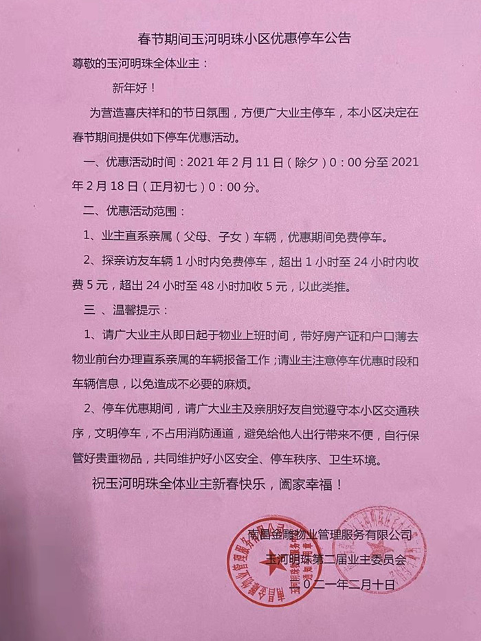 为营造喜庆祥和的节日氛围,方便广大业主停车,本小区决定在春节期间提供如下停车优惠活动。