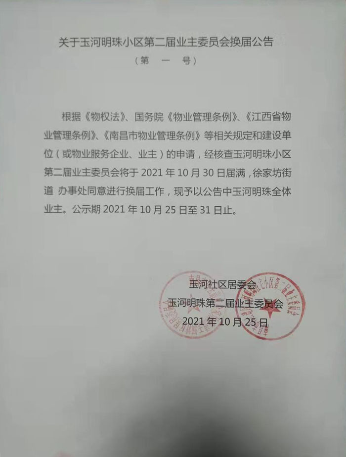 根据《物权法》、国务院《物业管理条例》、《江西省物业管理条例》、《南昌市物业管理条例》等相关规定和建设单位(或物业服务企业、业主)的申请,经核查,南昌市青云谱区徐家坊街道玉河社区玉河明珠小区第二届业主委员会,解放西路(49)号的玉河明珠小区(物业项目名称)已符合换届业主大会业主大会成立的条件,现将组建业主大会筹备组的有关事项公告如下: