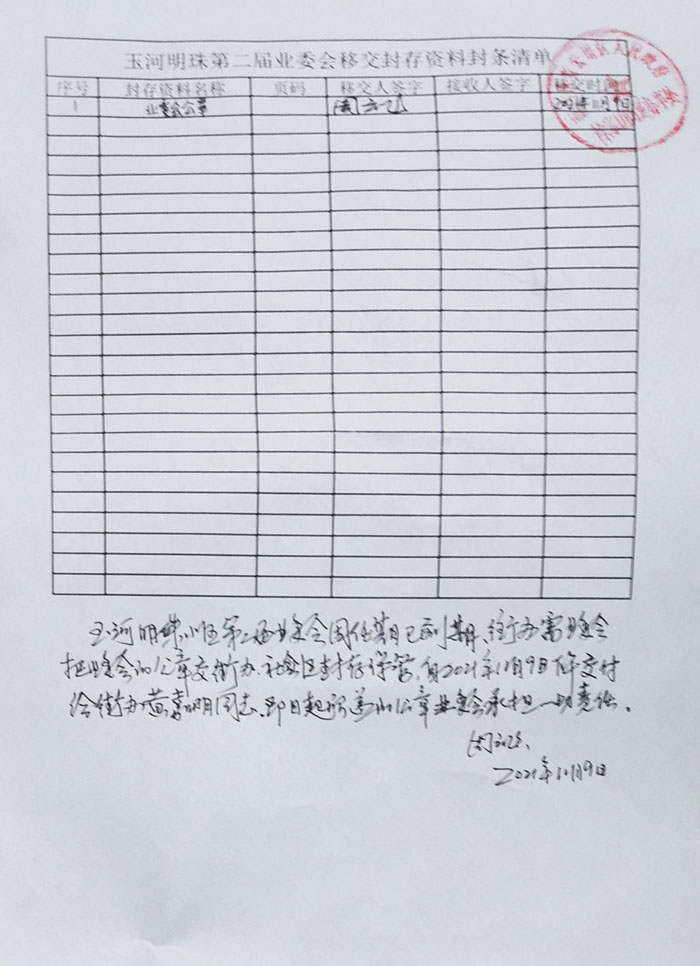 到期后接所在地街办通知,于2021年11月9日将公章移交所在地街办接收人进行封存。 另:据现场业主反映,此次移交工作中,业委会未就移交财务等资料给予明确回复。使得业主要求街办介入对业委会三年来财务审计工作无法正常推进。